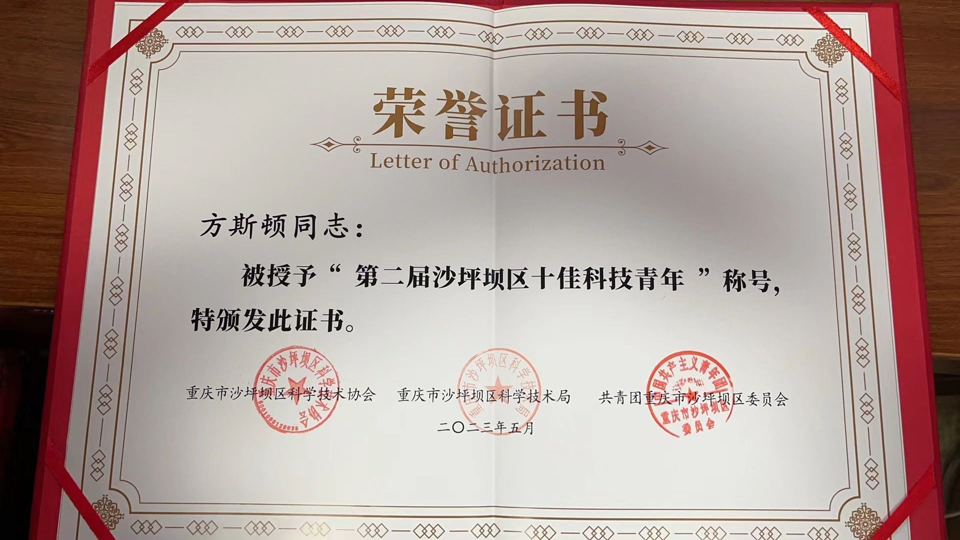 近日,沙坪坝区2023年“全国科技工作者日”“科技活动周”主题活动暨“争当创新驱动排头兵 助力建设创新驱动示范区”座谈会于当地召开。该主题活动由沙坪坝区委、区政府主办。会上,沙坪坝区委书记唐小平为新建科技社团和新获评市级科普基地授牌,为2023年全区“最美科技工作者”和第二届“十佳科技青年”颁奖。我院方斯顿教授因其潜心技术攻关,为高水平科技自立自强贡献智慧力量,荣获本届“十佳科技青年”荣誉称号。奋斗是青...