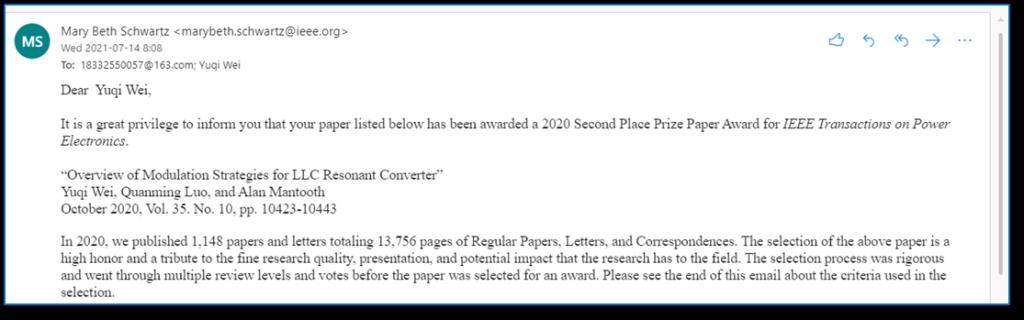 近日,IEEE电力电子学会(Power Electronics Society, PELS)正式公布了旗舰期刊IEEE Transactions on Power Electronics(IEEE TPEL)2020年度最佳论文奖(Best Paper Award)。该刊2020年度共出版1148篇论文,评选出了一等奖论文4篇、二等奖论文6篇,具体获奖名单见链接://www.ieee-pels.org/awards/ieee-transactions-prize-paper-award/2020-winners?highlight=WyJzZWNvbmQiLCJwbGFjZSIsInNlY29uZCBwbGFjZSJd)。我...