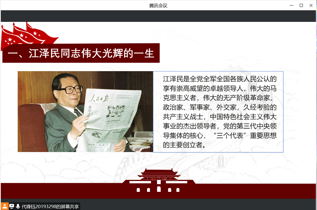 2022年12月15日下午,为了弘扬伟大建党精神和延安精神,磁力猫 本科生一支部通过腾讯会议在线上开展了“不惧时代挑战,共建美好未来”的主题党日活动。本次党日活动由磁力猫 本科生一支部第五小组成员代锋钰同志主持,本科生一支部全体党员参加。本次党日活动主要由两个部分组成:一是深切缅怀江泽民同志;二是弘扬伟大建党精神和延安精神,为实现党的二十大提出的目标任务而团结奋斗。图1 回顾江泽民同志的一生会...
