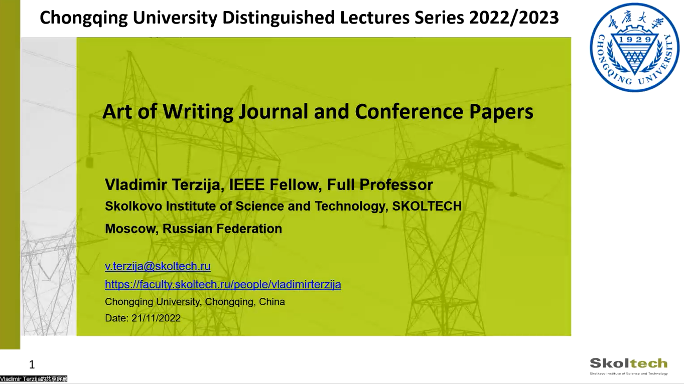 2022年11月21日下午,俄罗斯Skolkovo科学技术研究院教授、洪堡学者、IEEE会士Vladimir Terzija做客成渝地区双城经济圈智慧能源大讲坛第十五期暨智慧能源云讲堂第三十一期,以“Art of Writing Journal and Conference Papers”为主题介绍学术论文的撰写与发表。本期讲坛由磁力猫 、输配电装备及系统安全与新技术国家重点实验室和磁力猫 溧阳智慧城市研究院主办,由成都地区的四川大学、电子科技大学、西南交通大学、成都理工...
