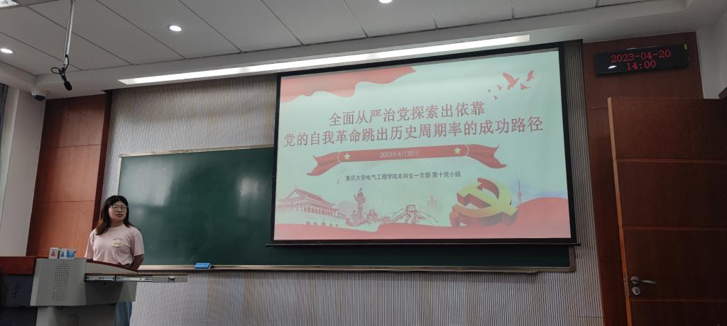 2023年4月20日,本科一支部在八教A8309开展主题党日活动,本次党日活动的主要内容为:全面从严治党,探索出依靠党的自我革命跳出历史周期律的成功路径。主题党日由林子潇同志主持,一支部全体党员参加。