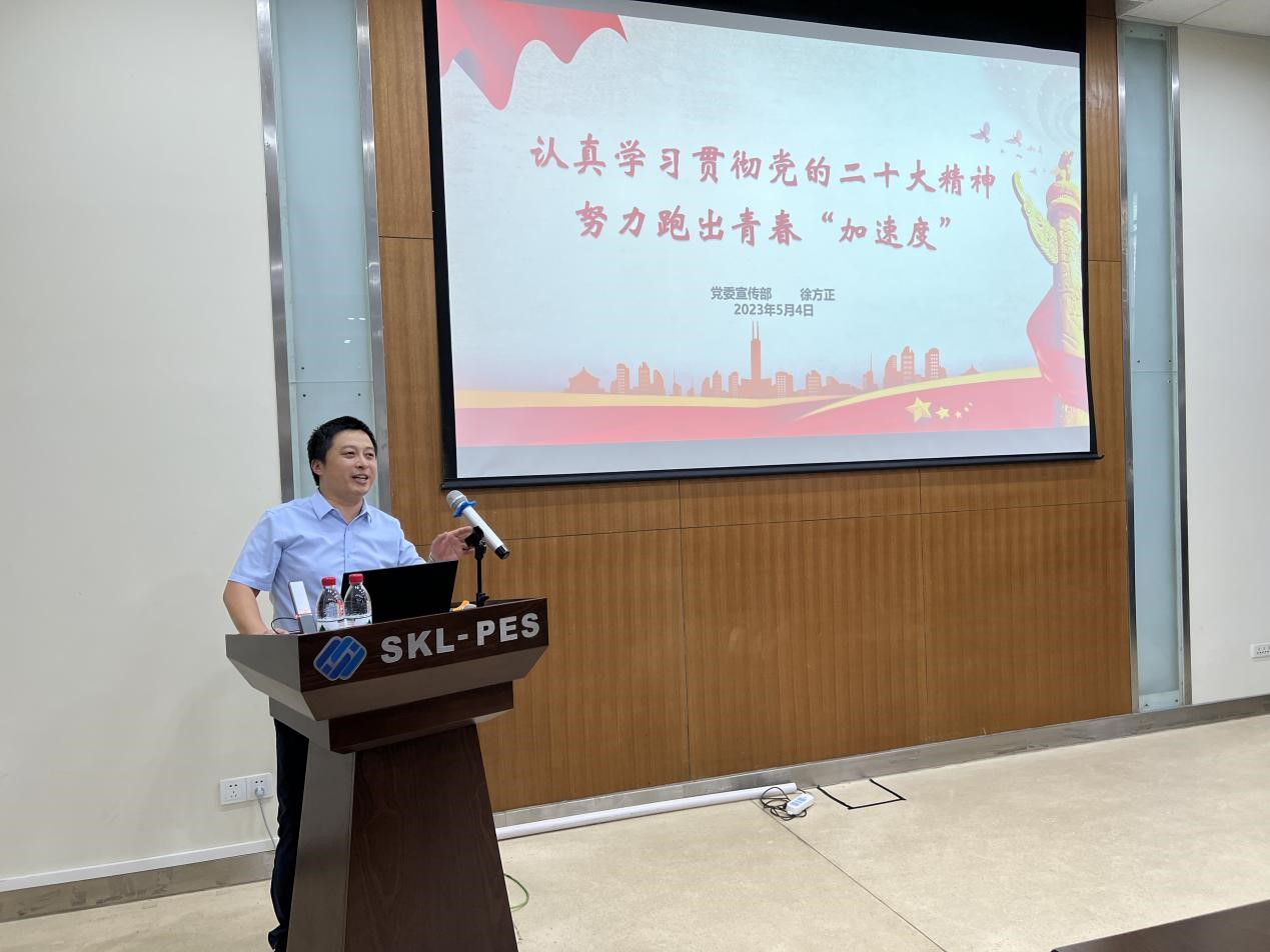 徐方正以《认真学习贯彻党的二十大精神,努力跑出青春“加速度”》为题,从党的二十大报告的主题内涵、过去五年的工作和新时代十年的伟大变革、开辟马克思主义中国化时代化新境界、新时代新征程中国共产党的使命任务等几个方面全面系统地解读了党的二十大报告。他讲到,今天恰逢五四青年节,习近平总书记在给中国农业大学科技小院同学们的回信中殷切寄语“希望同学们志存高远、脚踏实地,把课堂学习和乡村实践紧密结合起来,厚植爱农情怀,练就兴农本领,在乡村振兴的大舞台上建功立业,为加快推进农业农村现代化、全面建设社会主义现代化国家贡献青春力量”。