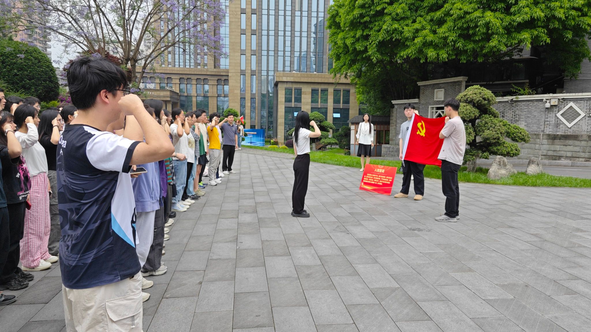活动伊始,全体党员在周公馆广场前集合,面对鲜艳的党旗,举行了庄严的宣誓仪式。在领誓人的带领下,党员们高举右手,重温入党誓词,表达了对党的忠诚和对革命事业的坚定信念。宣誓声铿锵有力,回荡在广场上空,激励着每一位党员不忘初心、牢记使命,为党的事业奋斗终身。