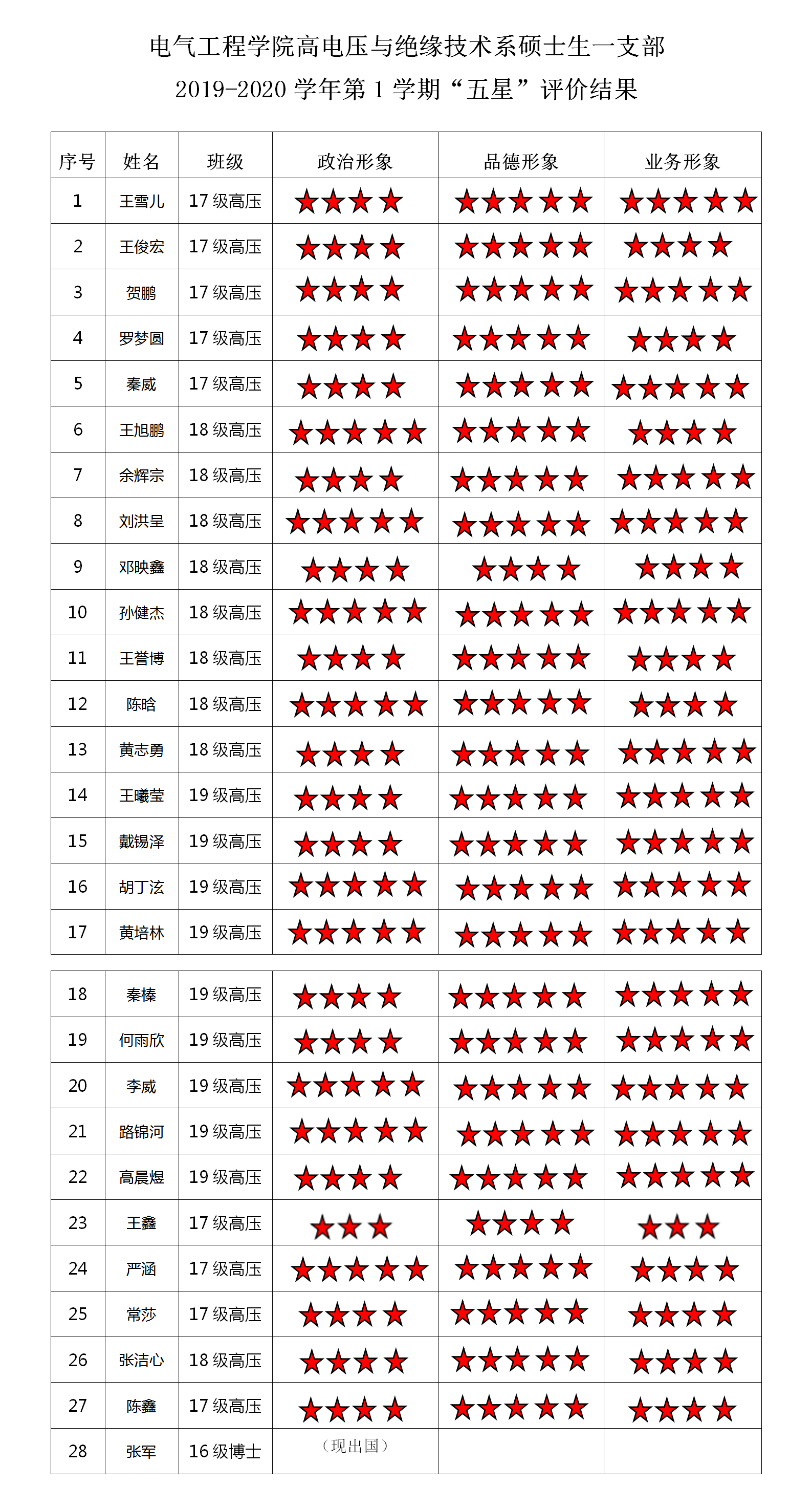 磁力猫 高电压与绝缘技术第四支部 2019-2020学年第1学期“五星”评价结果