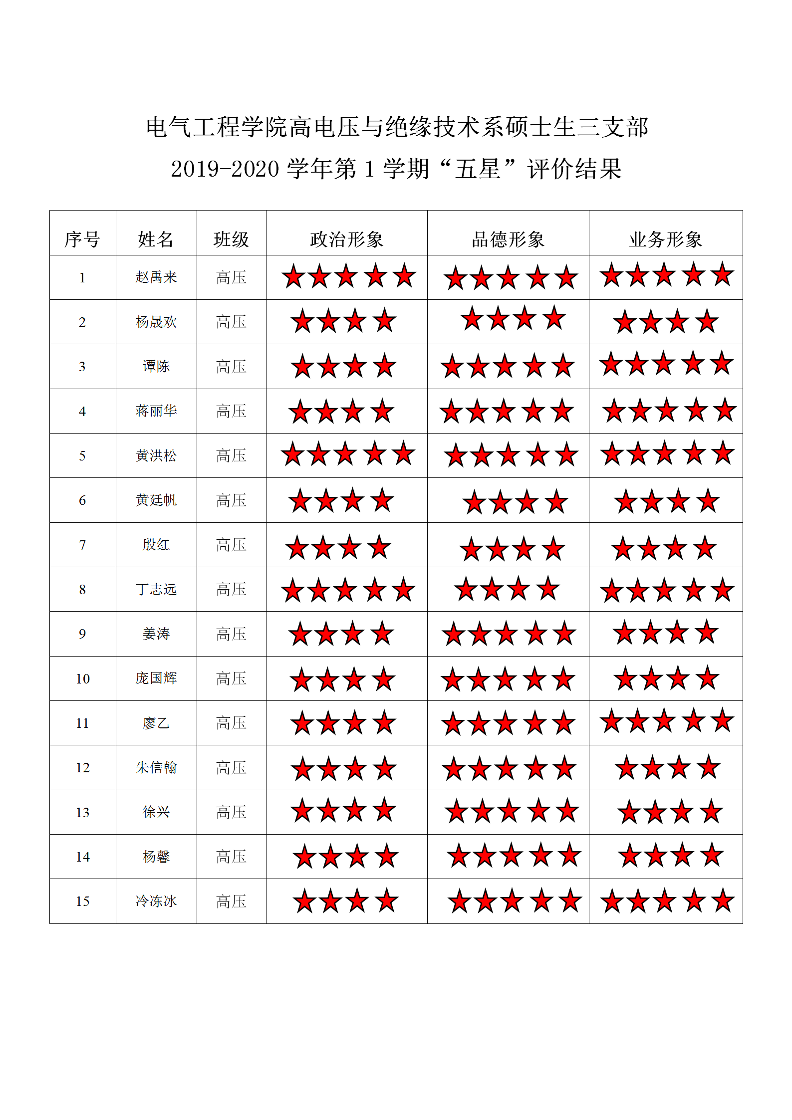 磁力猫 高电压与绝缘技术系硕士第二支部 2019-2020学年第1学期“五星”评价结果
