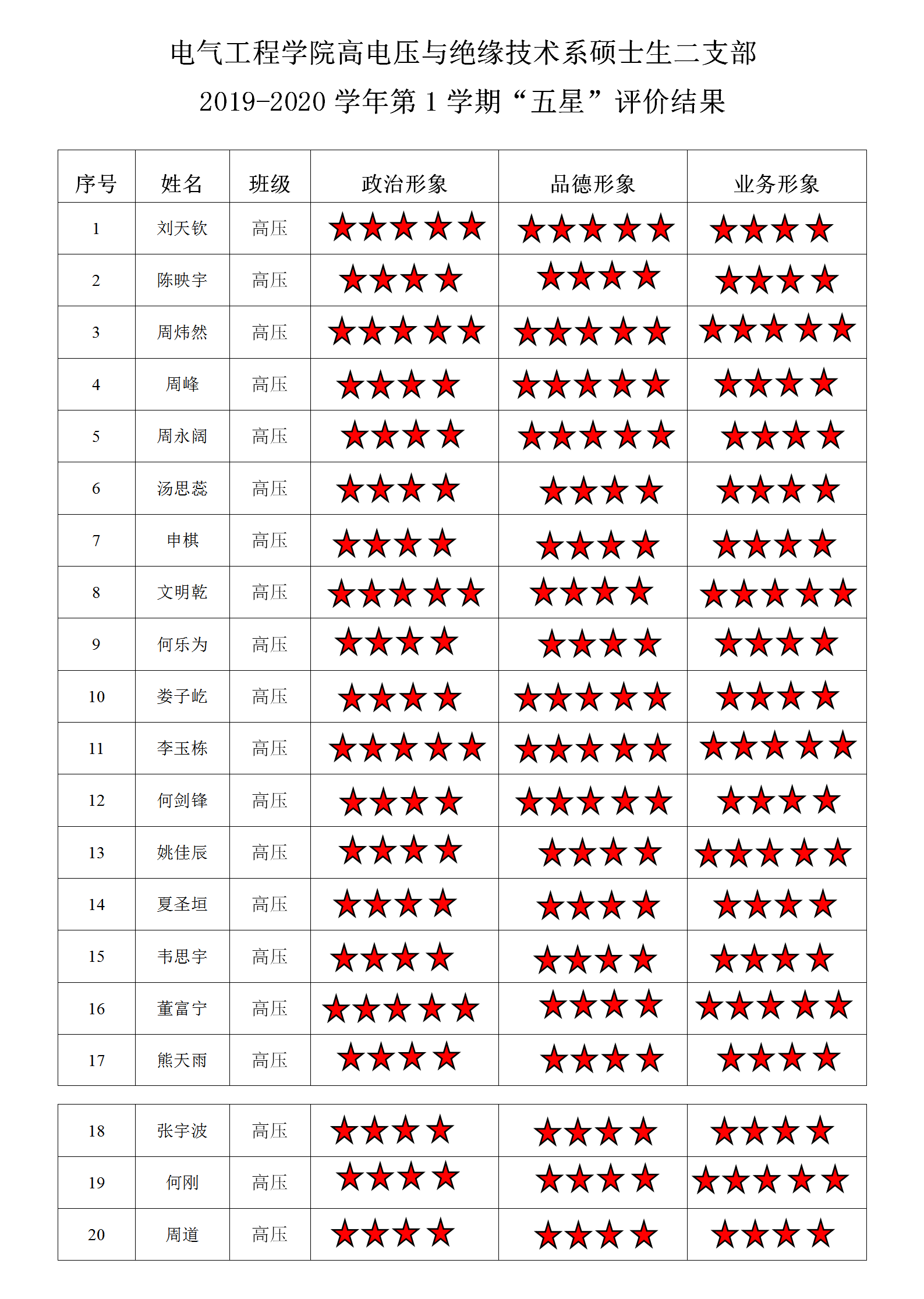 磁力猫 高电压与绝缘技术系硕士第二支部 2019-2020学年第1学期“五星”评价结果