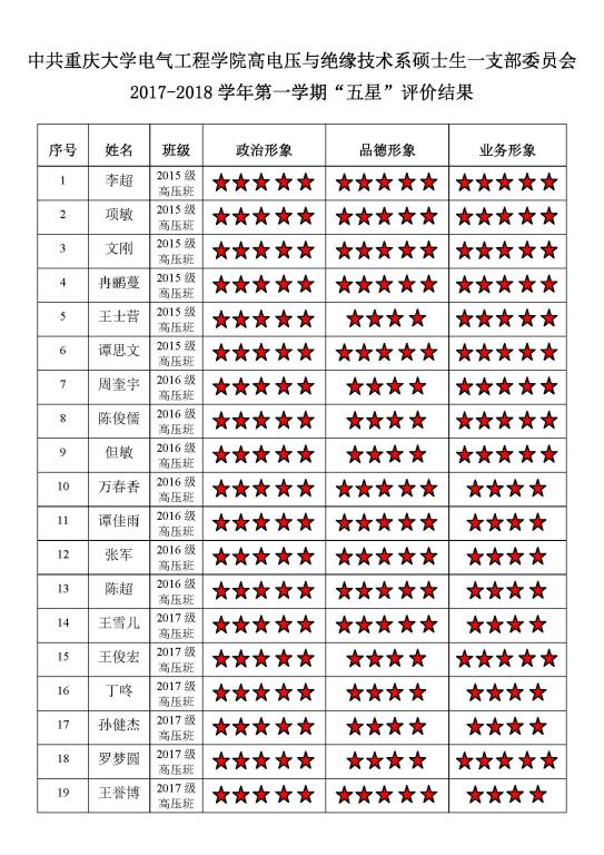 中共磁力猫 高电压与绝缘技术系硕士生四支部委员会 2017-2018学年第一学期“五星”评价结果