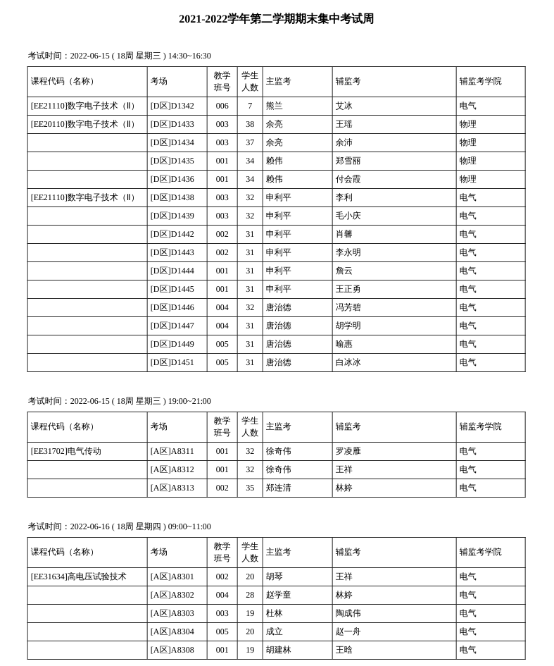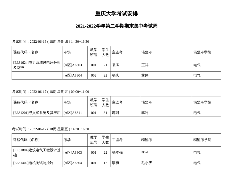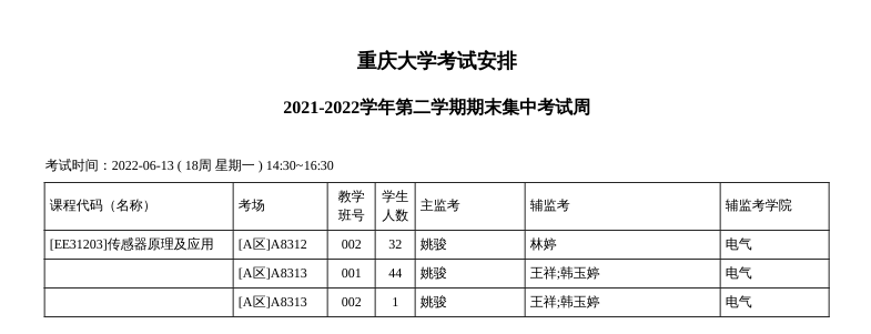 2021-2022第二学期期末集中考试周(18周)考试安排