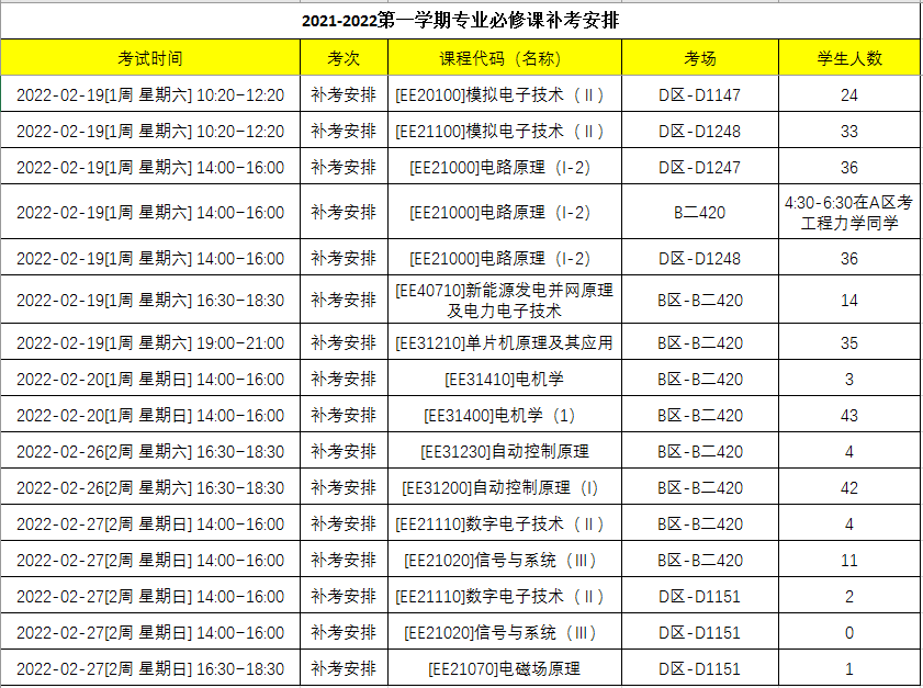2021-2022第一学期专业必修课补考安排