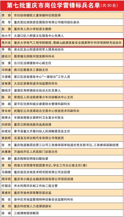 为进一步推动岗位学雷锋活动深入开展,重庆市决定命名涪陵区医疗保障事务中心参保管理科等30个单位为第七批重庆市岗位学雷锋示范点,李容等30名同志为第七批重庆市岗位学雷锋标兵,我院蒋兴良教授荣获第七批重庆市岗位学雷锋标兵称号。