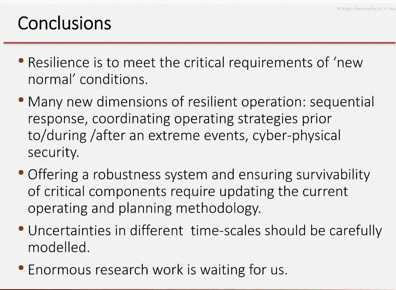 除此之外,侯教授还对信息物理系统进行了简要介绍。侯教授强调,弹性系统是满足“新常态”条件的关键要求,其弹性运行包含连续反应、在极端事件各阶段的协调运作策略等新的维度,想要建设一个鲁棒性强的系统并确保关键部件的可生存性,则需要更新当前的运营和规划方法。