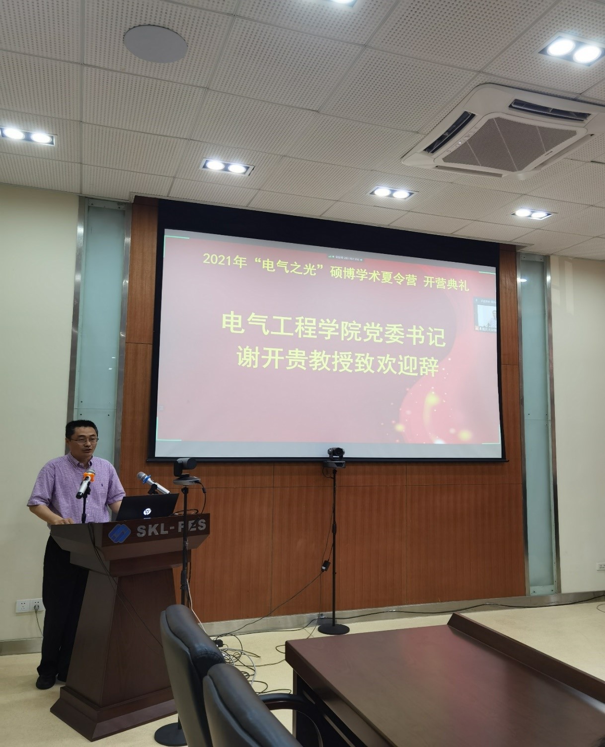 学院党委书记谢开贵教授首先致欢迎辞,谢书记对来自五湖四海的莘莘学子表示了热烈的欢迎,恭喜大家经过严格筛选入选了“电气之光”硕博学术夏令营。谢书记介绍了夏令营入营的筛选原则,对磁力猫