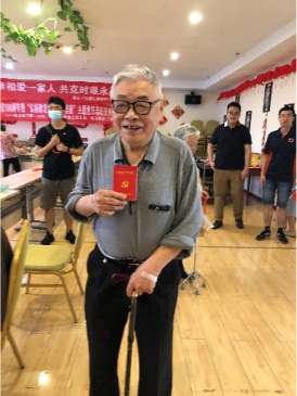 庆典结束后,大家到各楼层探望行动不便的爷爷奶奶们,聆听他们分享党的历史故事和祖国往事,从他们口中,我们可以深切感受到党和国家从往日的硝烟弥漫中走到今天的繁荣富强是多么的难得。他们的笑容是建党100周年的最好的礼物之一。