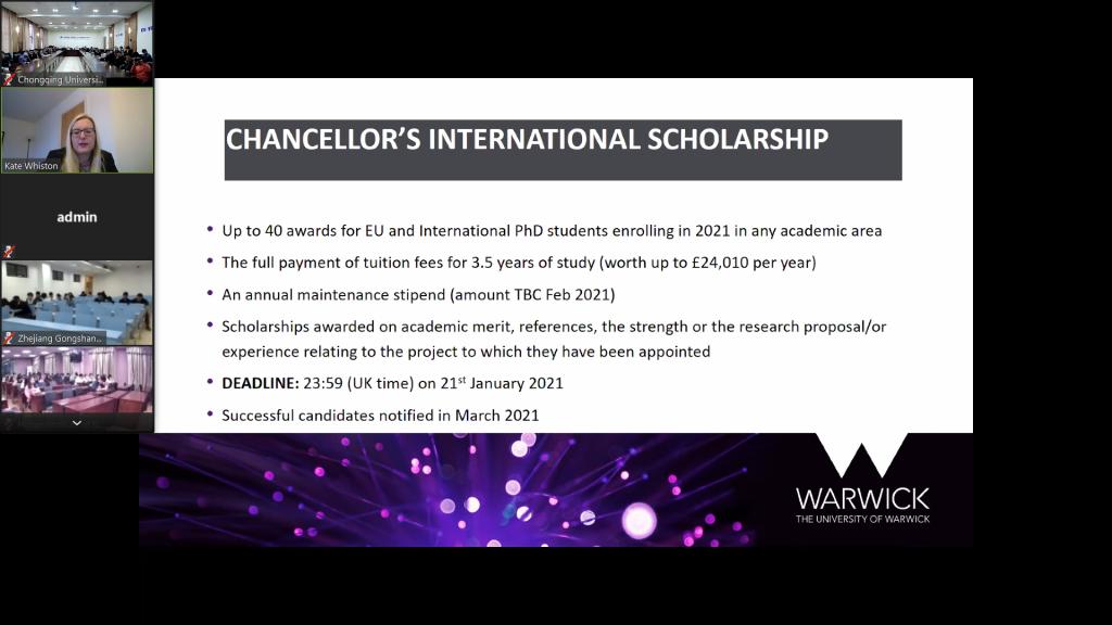 宣讲内容结束后,我院同学积极参与问答环节,华威大学国际招生处代表对同学们关注的CSC博士奖学金资助、硕士及博士生项目申请流程等问题做出了详细解答。其中Kate女士重点说明了华威大学与CSC的合作,包括每年25个联合资助的博士生奖学金名额,以及对申请成功的同学提供生活津贴和往返机票的补贴,并特别提醒大家CSC奖学金资助的申请截止日期为2021年1月21日。对于项目申请的材料与流程,华威大学的官网中有详细介绍,需注意不同学院的要求并不完全一致,同学们需仔细查阅官网信息。