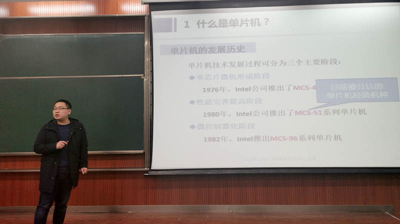 团委科学技术协会主办,由18级科协副主席汤心宇同学主持,并荣幸邀请到电工电子国家级实验教学示范中心的王唯老师主讲,旨在让大一参赛成员熟悉51单片机及C语言在51单片机中的功能与运用,增加19级同学们的基础知识储备,为即将到来的电赛初赛打下坚实基础。