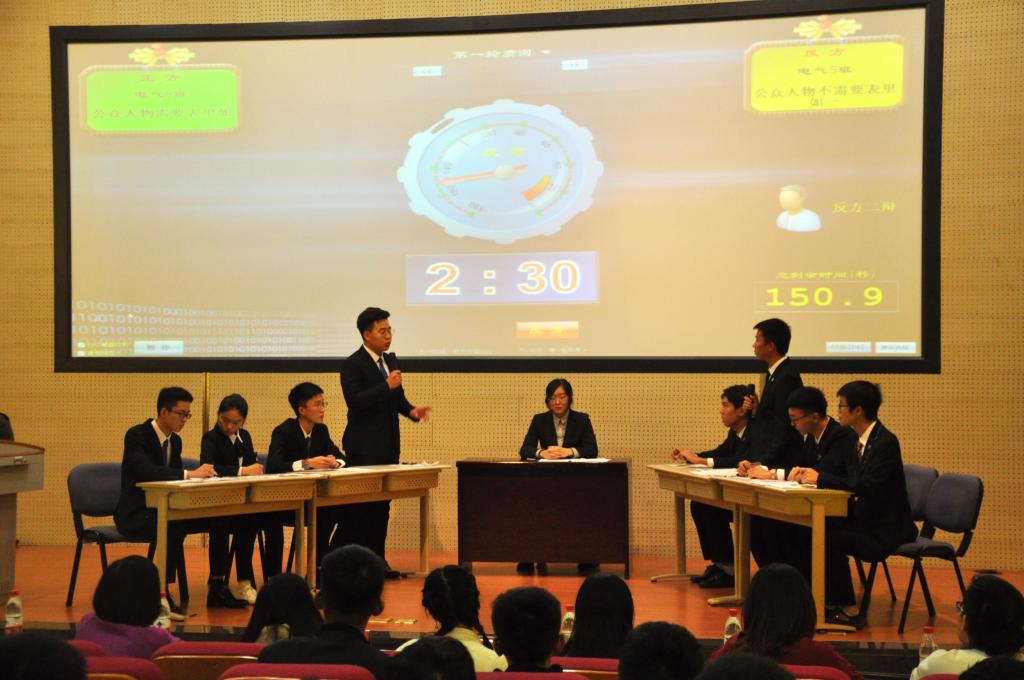 比赛伊始,首先由正方一辩施嘉伟同学进行立论陈词,表明了正方“公众人物要表里如一”的观点,并列举了柯震东、范冰冰等名人的事例佐证“道德要求公众人物更需表里如一”的观点。随后,反方一辩张志豪同学也不甘示弱,以“公众人物公众场合表里不如一可以带来好的社会影响”进行反驳,并列举了崔雪莉、罗斯福等例证明自己的观点。现场气氛逐渐升温,正反双方辩手皆摩拳擦掌,为接下来的攻辩做准备。