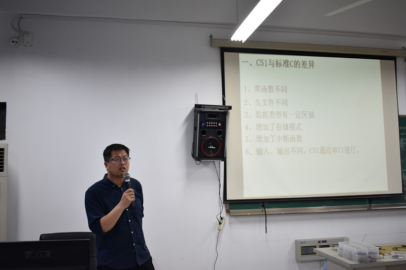 本次培训的主题围绕51单片机的C51编程展开。全瑞坤老师从C51与标准C的差异、C与汇编、C51的数据类型、存储类型与存储模式等多个方面,为同学们进行了细致全面的讲解。紧接着,全瑞坤老师概况性地为同学们描绘出了一个C51编程的大致框架,并且就一些实际中的应用,如接口控制、计时器控制等,进行了具体源程序的实例分析,同学们也跟着老师在自己的电脑上操练程序编写。培训会巧妙将理论与实践相互结合的特点使得同学们沉浸其中。
