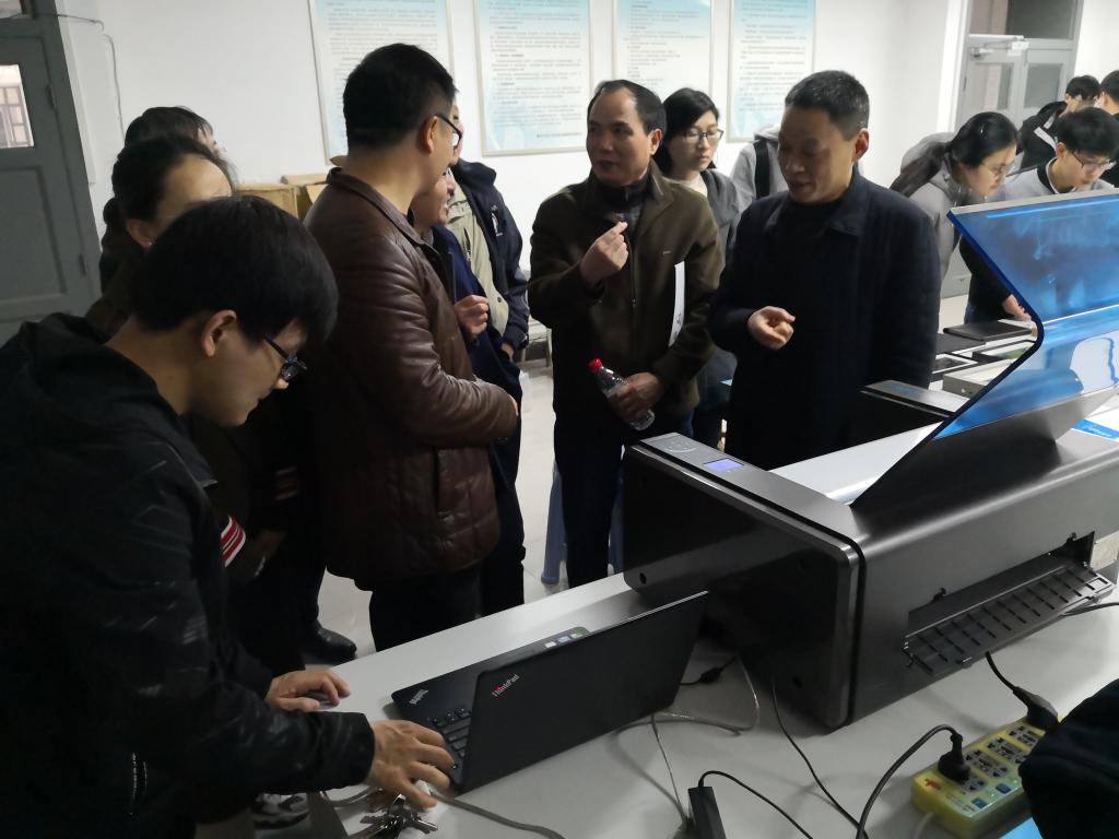 随后,老师们在梦之墨技术人员的指导下,观摩了梦之墨液态金属电子电路制造系统DP-I的液态金属电路板制作过程,并近距离接触了基于液态金属电路打印技术实现的多类电路样品,例如高密度集成电路模块、艺术装饰电路、柔性可穿戴设备电路等。很多感兴趣的老师主动与技术人员交流液态金属电路打印技术的前沿应用和方案可实现性。技术人员通过全程演示和配套资料的分享,老师们基本能够使用液态金属电子电路制造系统进行简单电路板制作操作。