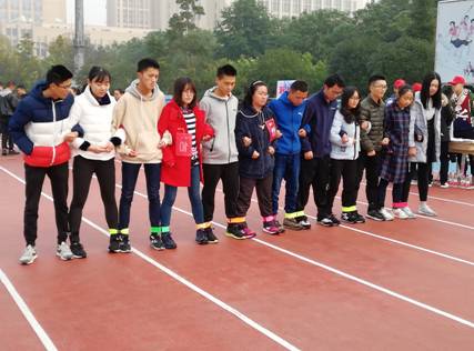 开幕式活泼的热身音乐追逐着各个学院招展舞动红旗,旗前一路路待征的“将士”在领舞人的带领下进行热身运动,而此时,依稀可以瞥见主席台后参加多人多足项目的同学进行着最后的磨合。