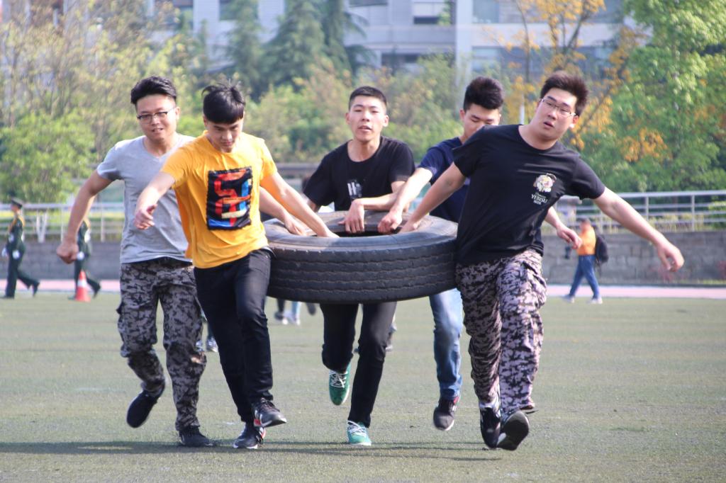 首先进行的是轮胎搬运,5名队员之间配合将6个轮胎搬运到指定地点。作为一项充满挑战且高难度的团体项目,