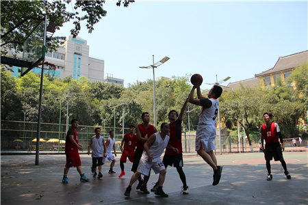两场比赛分别是研一高压队VS研二新技术队、教师队VS研一联合队。两场比赛同时进行,随着裁判员的哨响,比赛正式拉开序幕。场上,队员们敏捷地传球,奋力地争抢篮板,你争我夺,你攻我守,好不精彩。场下,观众们不断为自己喜欢的球队加油鼓劲,助威呐喊。