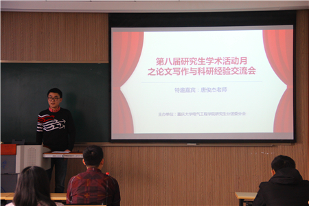 第八届研究生学术活动月之论文写作与科研经验交流会在A区八教503举行。本次活动由电气研究生分团委分会主办,学术部承办,邀请到IEEE、IET、电网技术等国内外期刊审稿人、硕士生导师唐俊杰老师作为嘉宾,交流会由学术部部长林伟同学主持。