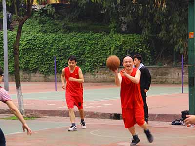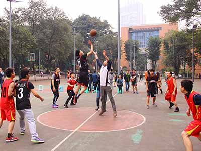 三场比赛分别是研一联合队VS研二三电班、研一新技术队VS教师队、研三新技术队VS研二新技术队。三场比赛同时进行,让人目不暇接,运动场上队员们迅速进入状态以矫健熟练的动作迅速传球,争夺篮板也是异常激烈。篮球场上你争我夺,不断地断球快攻令人眼花缭乱。赛场旁的观众们也是投入激烈的比赛中,不断为自己喜欢的球队加油鼓劲,助威呐喊,球场气氛十分活跃。