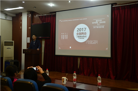 3月29日中午,“学习‘两会’精神,关注社会热点”党团活动在B区材料楼二楼报告厅举行。出席本次活动的领导和老师有材料学院党委副书记邓扶平、团委书记邵凤雨、研究生辅导员高洁,电气学院院长助理孟繁琦、研究生辅导员王婧。活动由材料学院研究生分团委分会、电气学院研究生分团委分会联合举办,百余名研究生学子参加。