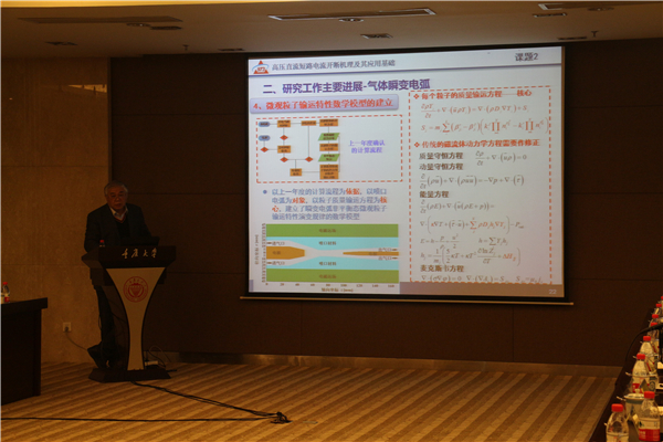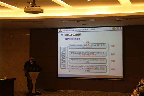 副校长廖瑞金致辞 荣命哲教授介绍了项目的总体研究进展,汇报了本年度在高压直流断路器新型拓扑结构、直流瞬变电弧等方面取得的创新成果,分析了项目5个课题的计划与执行情况,2016年度各项指标均完成了计划要求。