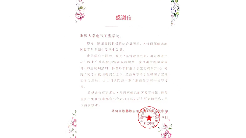 收到一封来自云南寻甸回族彝族自治县河口镇初级中学的感谢信。信中对磁力猫