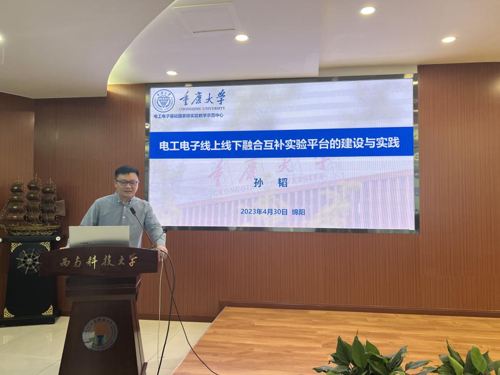 在4月30日举行的教学研讨会上,来自全国高校的8位专家和同行教师作大会报告,分别围绕实验教学内容与课程思政改革、实验教学模式改革、实验案例设计与推广、实验室及实验教师队伍建设等主题进行了分享。中心教师孙韬以电工电子基础实验教学示范中心近几年的实验教学平台建设实践经验作了“电工电子线上线下融合互补实验平台的建设与实践”的分享报告,介绍了在教育数字化转型背景下本校电工电子基础实验教学示范中心虚仿和远程实验平台建设概况、教学实施情况以及后续完善规划。