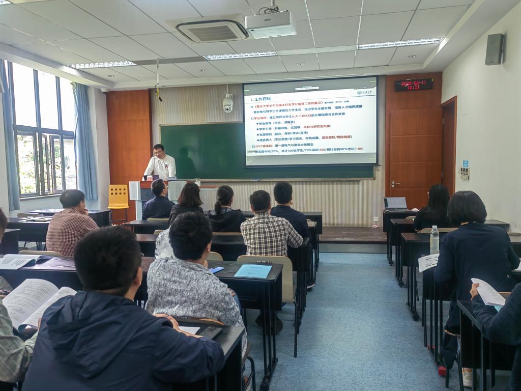 在A区八教302教室开展了2021级学业导师工作培训。会议由副院长张淮清主持,党委副书记吴嘉、2021级全体学业导师、学办主任罗敏、本科教务办公室副主任李惟卫、教务老师但晓群参加了会议。
