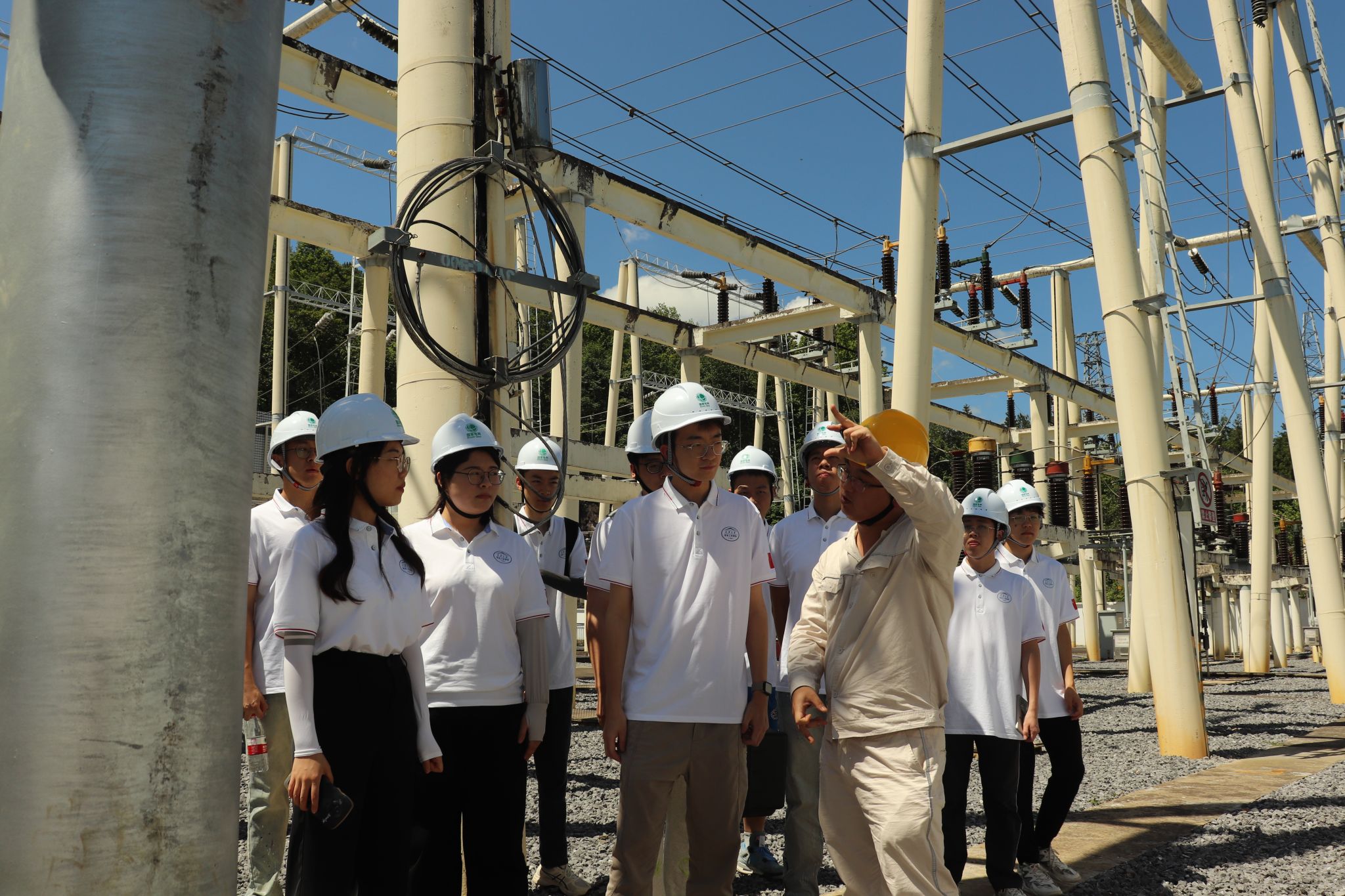 在肖工的带领下,成员们进入变电站内部。参观期间,肖工为实践队成员们详细介绍了电气主接线、断路器、隔离开关等电气设备以及变电站基本情况。肖工表示:“仙女山变电站作为景区电力枢纽,为保障仙女山旅游风景区,仙女镇居民用电安全发挥重要作用”。