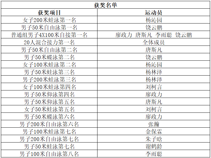 游泳赛事最佳记录。其中选手饶云鹏在男子50米自由泳决赛中以28.80秒的成绩位列全校第一,选手杨沁园在女子200米蛙泳以4分29.80秒的成绩位列全校第一,廖政力、唐斯凡、李雨聪、饶云鹏四位同学在男子4x100米自由泳接力决赛以2分15.97秒的成绩勇夺第一,在20人混合接力项目中以6分53.44秒的成绩位列全校第一。