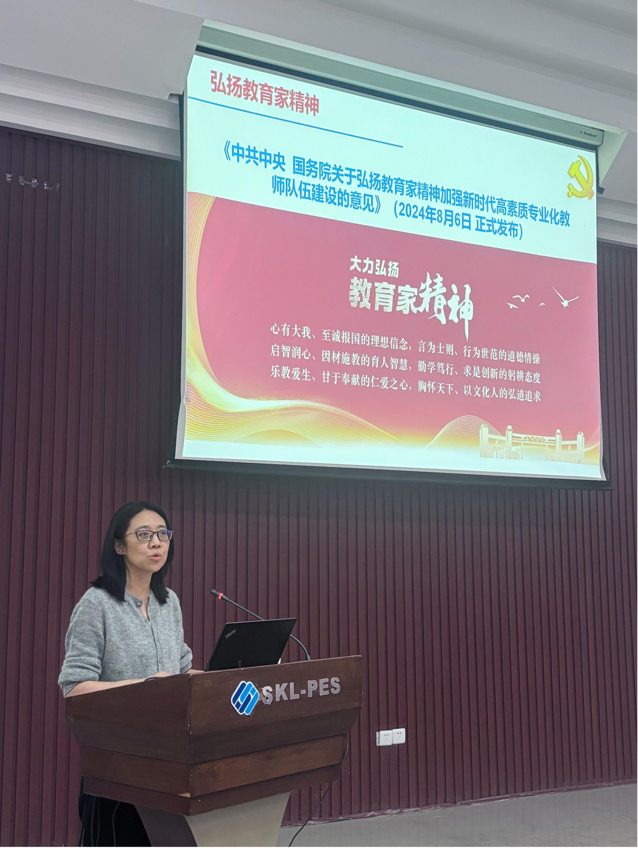 在六教6117报告厅召开2024-2025学年第一学期教职工大会。本次大会共分为学院近期工作通报和传达党的二十届三中全会精神专题宣讲会两部分。学院党委书记胡建林,党委副书记王晓静、吴嘉,副院长杜雄、国家野外科学观测研究站专职副站长张志劲出席会议。大会由王晓静副书记主持。