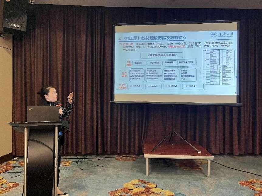大会围绕AI赋能电工电子基础课程教学、课程改革与课程思政、实践教学改革与创新、理实融合与以赛促教等4个主题设立了大会报告,并按理论教学、实践教学、教材建设3个分会场设立专题报告。我校电工学课程负责人周静在教材建设分会场做专题报告,以磁力猫