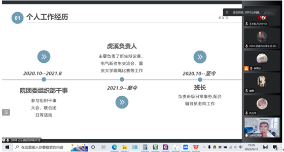 学生会主席团候选人公乐腾从团委认识、工作思路入手,针对下一届的大类招生提出了部门改革的方案,优化了学生会的部门构成及各部门分工,为团委学生会发展提出建议。答辩环节,针对“如何度过低迷期”的问题,公乐腾从自身情况出发,提出了合理的解决方案和建议,低迷期积极调整,尽快回归正常状态。而后,其他主席团候选人依次进行了答辩,他们各展风采,畅谈工作规划,沉着面对提问。其中候选人张佳琪答辩时,谈到自己对工作理解和畅想,受到了喻惠老师和学长的赞赏与鼓励。至此,2020级干部换届答辩环节结束。