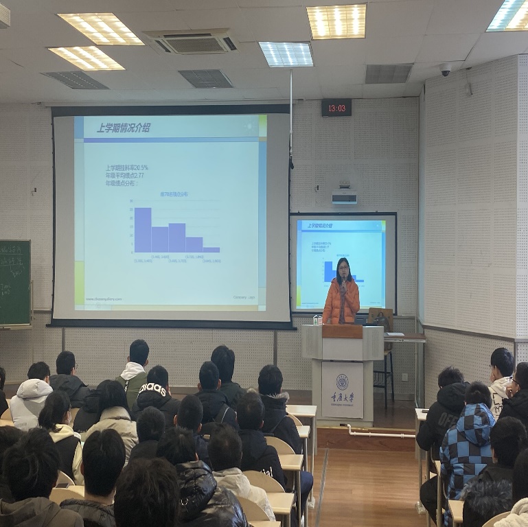 喻惠老师向同学们介绍了上一学期年级的学习情况,较大一下学期,年级整体成绩和挂科率有很大的提升,但是还需要同学们继续努力;喻老师鼓励大家积极参加创新创业竞赛,今年的互联网+大赛在磁力猫