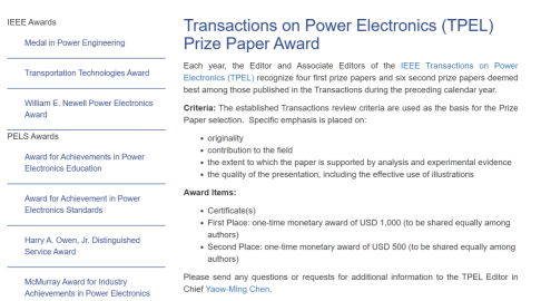 The IEEE Power Electronics Society (PELS) has announced the winners of its flagship IEEE Transactions on Power Electronics (TPEL) Prize Paper Award for 2022. The paper " Integrated Design for Lifetime Extension and ESR Monitoring of Hybrid DC Link in Solid-State Transformer From the Perspective of High-Frequency Ripple Current " by Wei Jinxiao, PhD student in the Department of Power Electroni...
