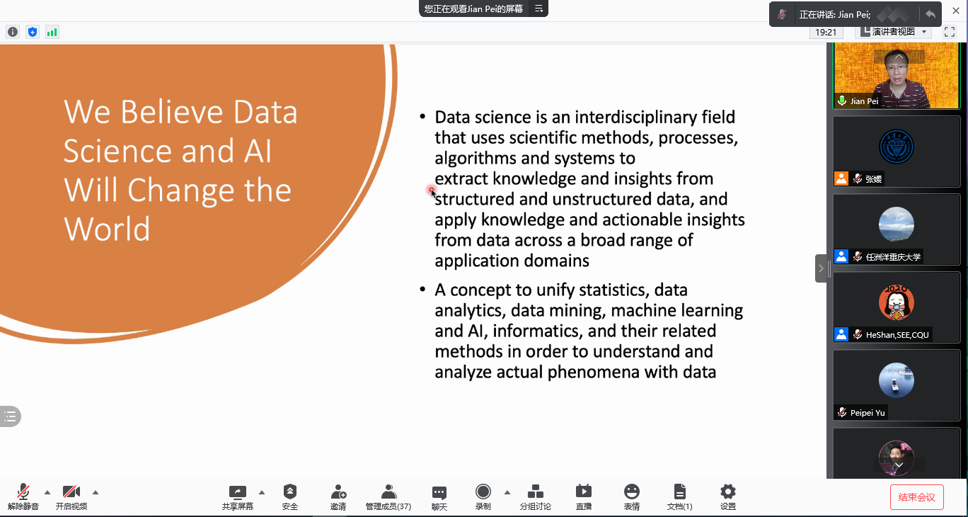 On the morning of July 16, 2021, Prof. Jian Pei, Fellow of the Royal Society of Canada, Academician of Canadian Academy of Engineering, IEEE Fellow and ACM Fellow from Simon Fraser University was invited to deliver a speech at the "Online Lecture Hall" on the topic of " Towards Trustworthy Data Science: Interpretability, Fairness and Marketplaces". The series of online academic lectures were jointly organized by the School of Electrical Engineering of Chongqing University, the State Key Laboratory of Power Transmission Equipment and System Security, and were hosted by Professor Ren Zhouyang, Dean Assistant of the School.