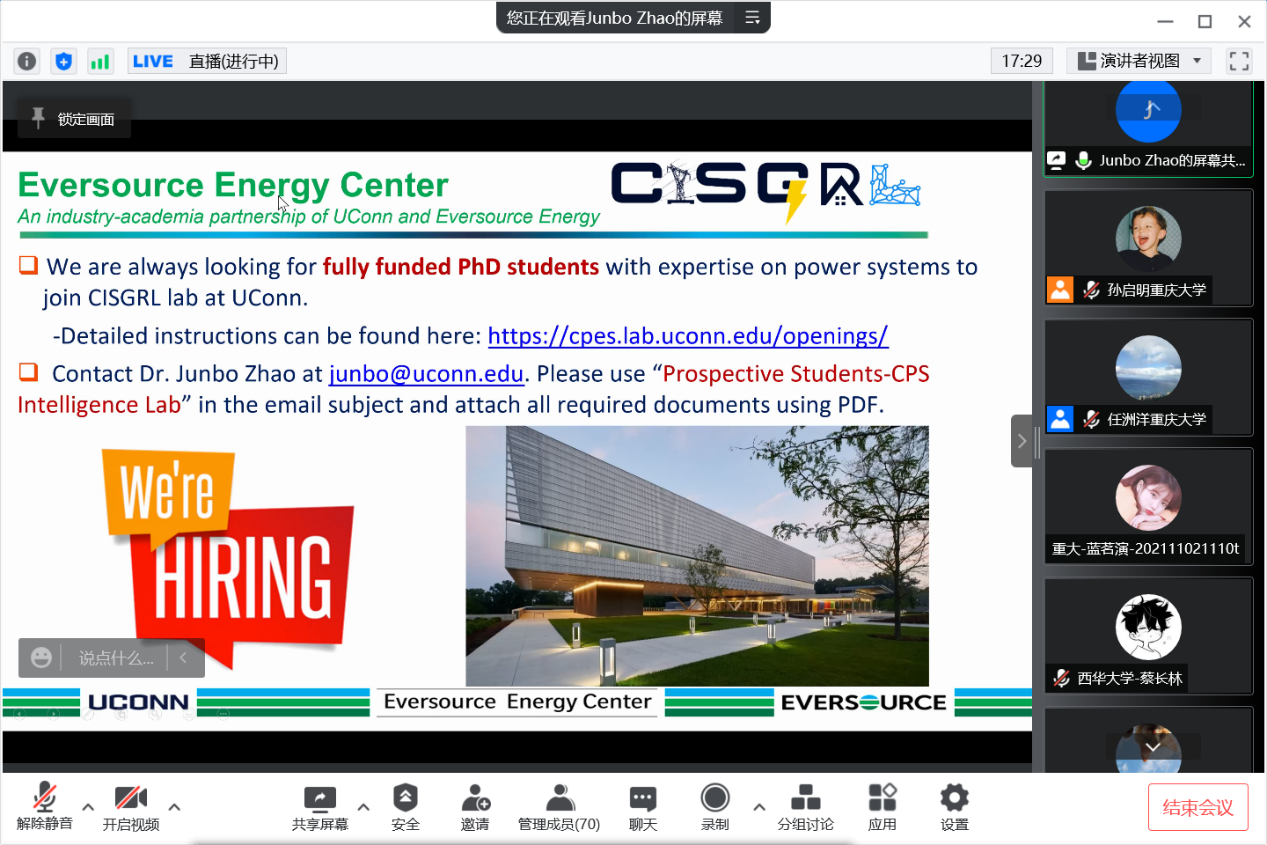 On the morning of April 24, 2022, Zhao Junbo, assistant professor with the School of Electrical and Computer Engineering, University of Connecticut, was invited to deliver a speech at the “Online Lecture Hall” on the topic of “Physics-Informed Deep Reinforcement Learning for Power System Optimization and Control”. The series of online academic lectures were jointly organized by the School of Electrical Engineering of Chongqing University and the State Key Laboratory of Power Transmission Equipment and System Security, and was hosted by Associate Professor Ren Zhouyang.
