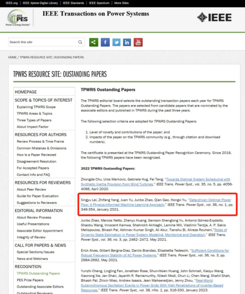 Recently, IEEE Power and Energy Society (Institute of Electrical and Electronics Engineers Power and Energy Society, IEEE PES ) has released its best papers for 2022. The paper "Data-Driven Optimal Power Flow: A Physics-Informed Machine Learning Approach " published by Postdoctoral researcher Lei Xingyu (first author), Professor Yang Zhifang (corresponding author) and Professor Yu Juan, etc., Department of Power Systems and Automation A Physics-Informed Machine Learning Approach, co-authored by Assistant Professor Junbo Zhao and others from the University of Connecticut, was awarded the best paper.