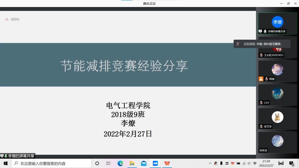 In order to encourage students to better and deeper understand the Energy Saving & Emission Reduction Contest and prepare for the innovation and entrepreneurship competition, School of Electrical Engineering hosted an online experience sharing meeting on February 27th, 2022, through Vivo Meeting. A number of senior students with rich competition experience were invited to share the experience with all participants.